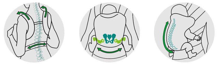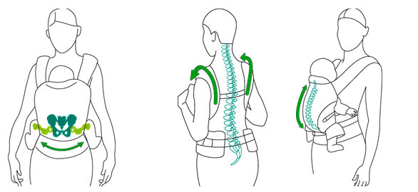 - ergonomiczny panel podtrzymuje plecy dziecka umożliwiając ułożenie ich w anatomicznej pozycji, a nóżki utrzymuje w pozycji "M" (żabki), co wpływa na prawidłowe kształtowanie się stawów biodrowych