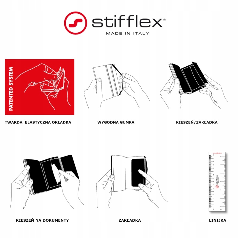 - Okładka notatnika Stifflex jest twarda i elastyczna jednocześnie. Jest to możliwe dzięki opatentowanemu systemowi, który zaprojektował Giuliano Mazzuoli założyciel marki Stifflex.