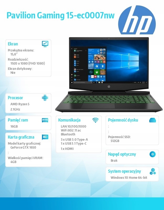 Notebook Pavilion Gaming 15-ec0007nw R5-3550H 512/16/W10H/15,6 8BL92EA