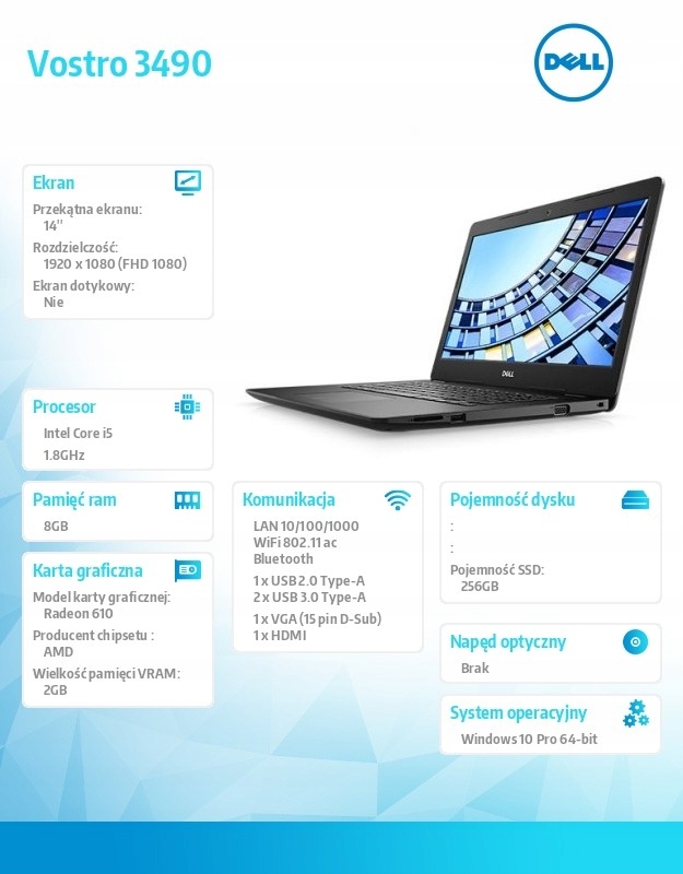 Notebook Vostro 3490/Intel Core i7-10510U/8GB/256GB SSD/14.0 FHD/Radeon 610 2GB/FgrPr/Cam & Mic/No optical drive/WLAN + BT/Kb/3 Cell/W10Pro