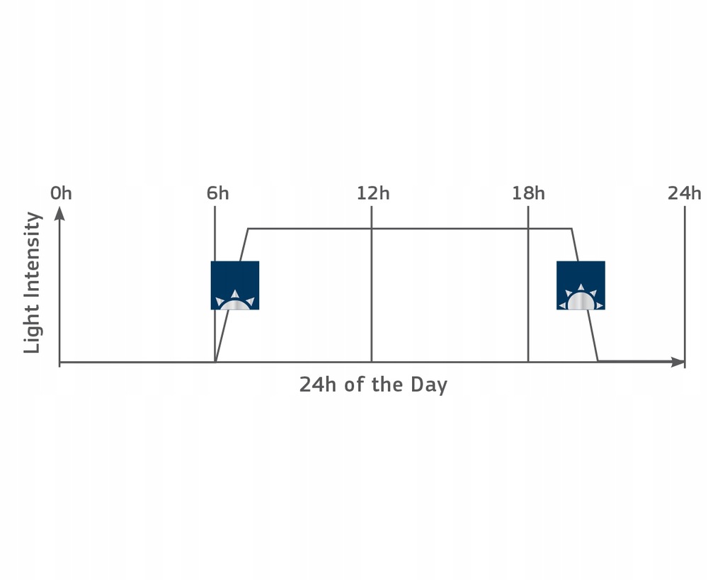 - Możliwość zaprogramowania indywidualnej godziny rozpoczęcia fazy oświetlenia na wschód i zachód słońca