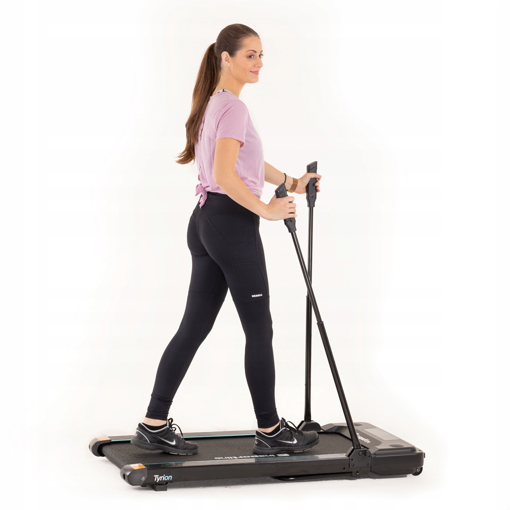 Nowczesna bieżnia, łatwa w użyciu, boczne uchwyty symulujące chodzenie z kijkami trekkingowymi.
