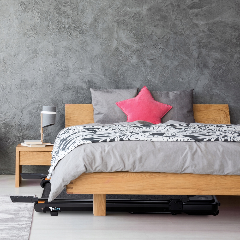 Na prawym uchwycie znajduje się panel sterowania z czterema przyciskami – start, stop i ustawienie prędkości. Ponieważ możesz schować bieżnię pod łóżkiem lub za szafką, jest idealna do użytku domowego.