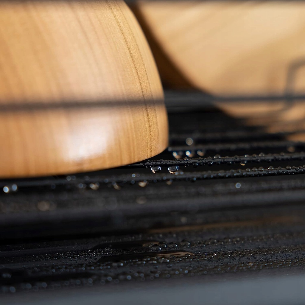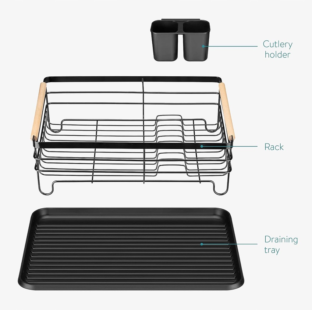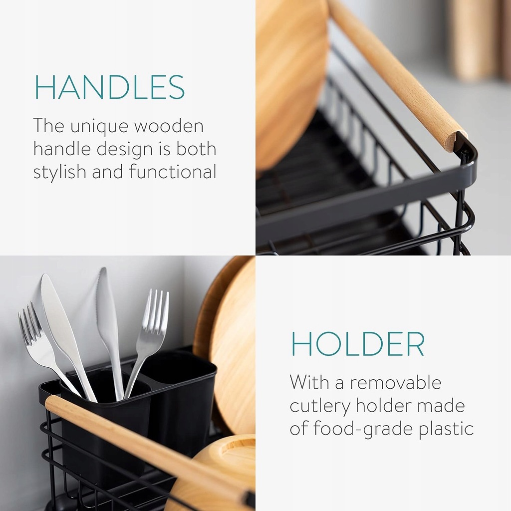 - Łatwa do przenoszenia: Suszarkę można łatwo wyjąć z tacy ociekowej. Możesz więc przenieść suche naczynia w wygodniejsze miejsce, aby umieścić je w szafce. Drewniane uchwyty ułatwiają przenoszenie.