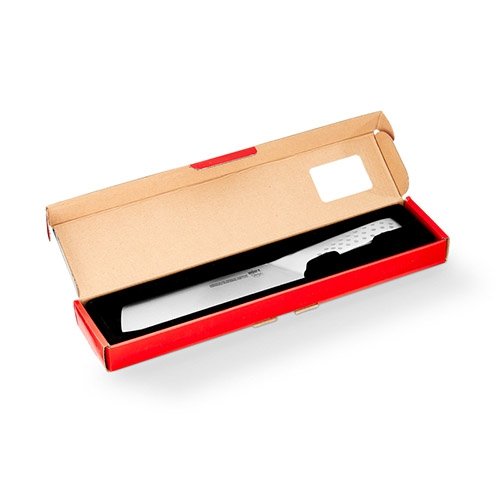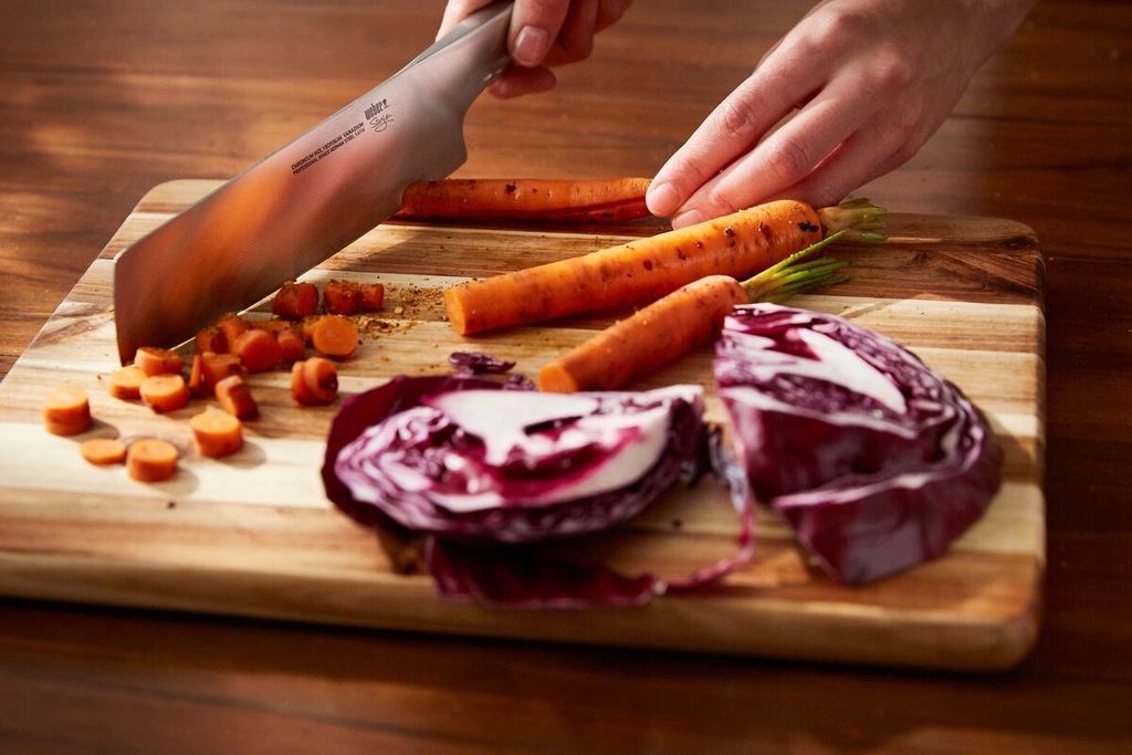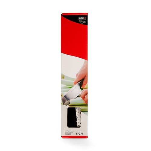 Wykonany w całości ze stali nierdzewnej nóż WEBER Deluxe 17071 ma ostrze o długości 19 centymetrów pozwala swobodnie kroić i siekać warzywa. Stal nierdzewna, z której wykonany jest nóż, charakteryzuje się dużą twardością i odpornością na kwasy i zasady zawarte w krojonych produktach. Ze względu na wykonanie w całości z metalu nóż ten można myć w zmywarce bez obawy, że ulegnie on zniszczeniu.