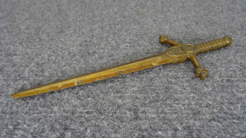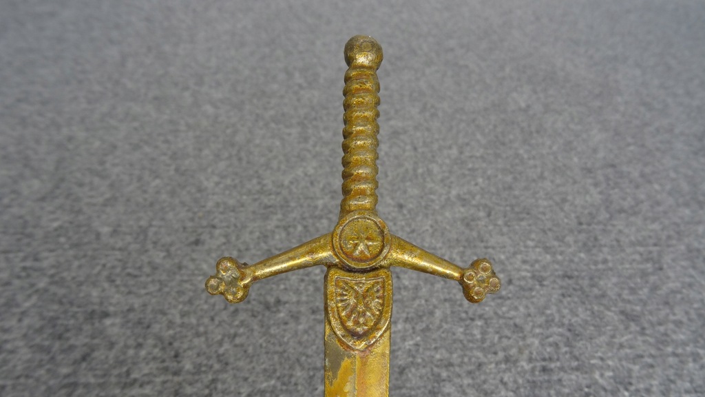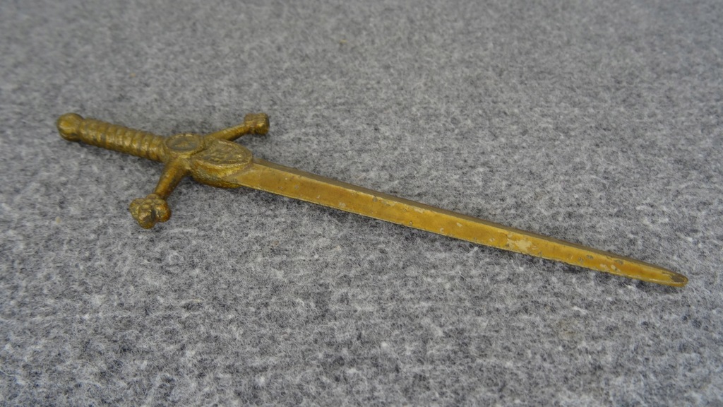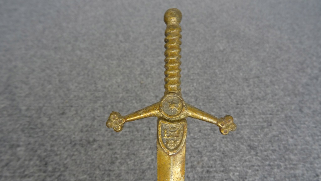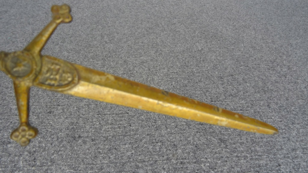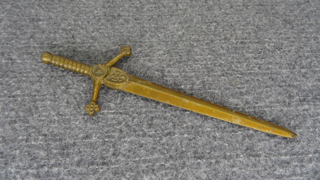 Nożyk do listów w formie miecza. Z jednej strony mieczyka kartusz herbowy z orłem z drugiej kartusz z herbem.
