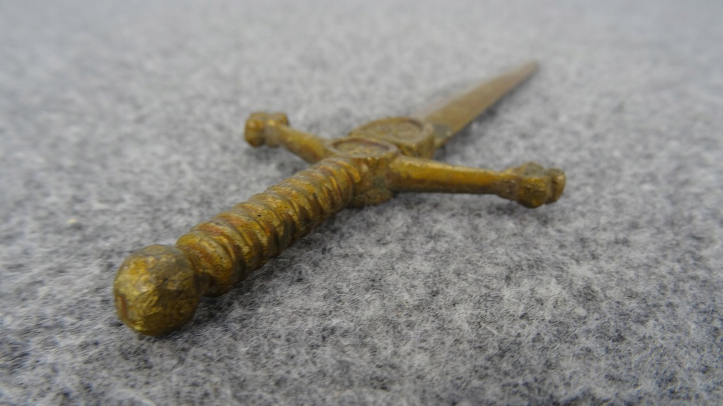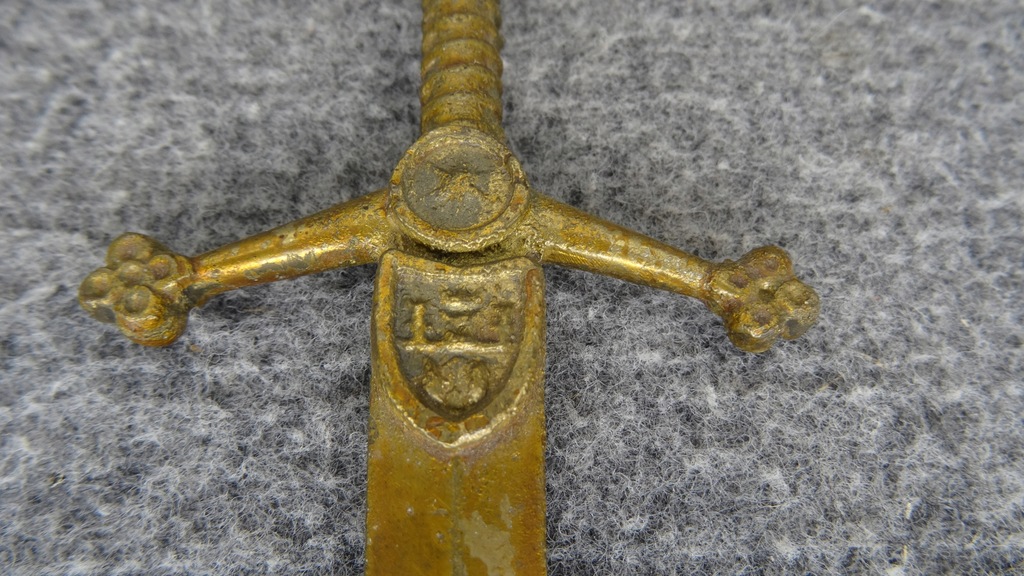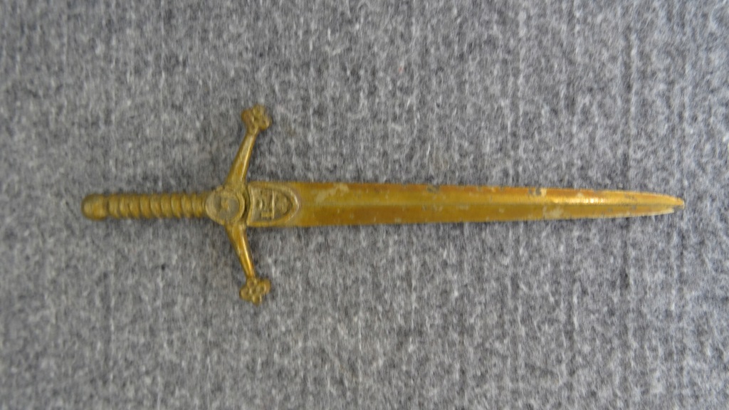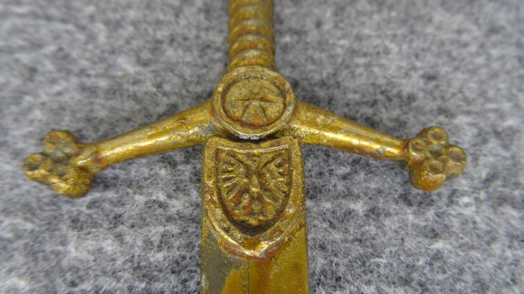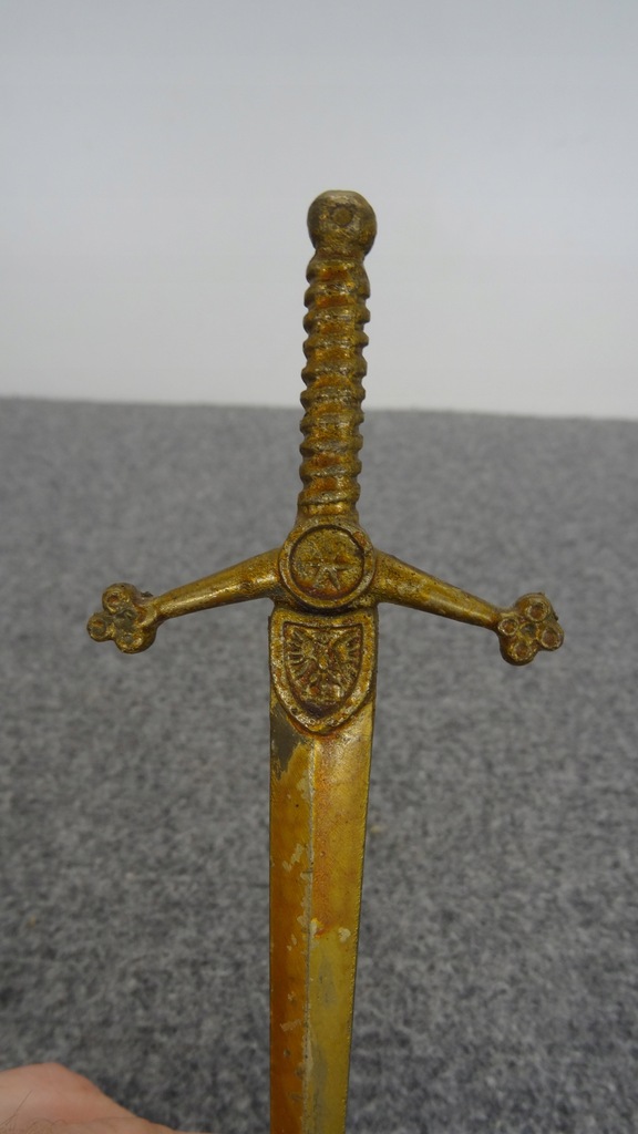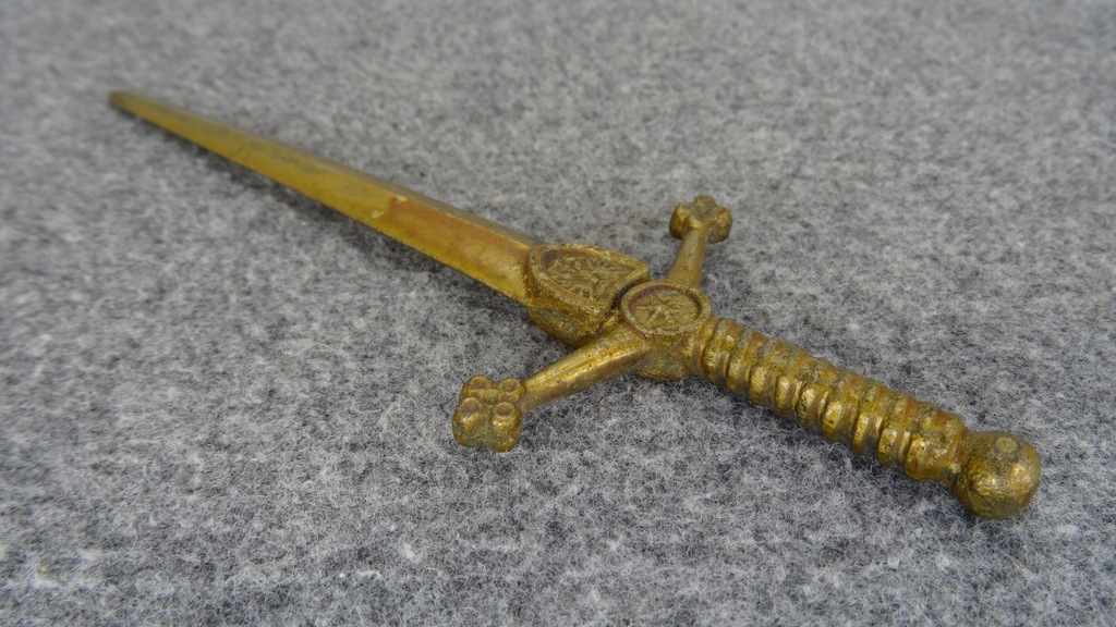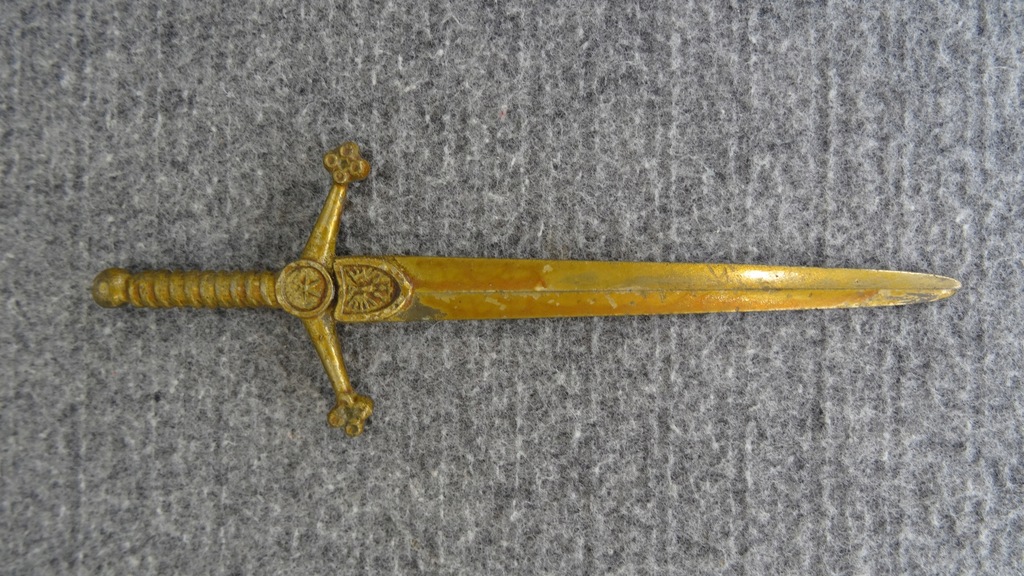 Nożyk do listów w formie miecza. Z jednej strony mieczyka kartusz herbowy z orłem z drugiej kartusz z herbem.