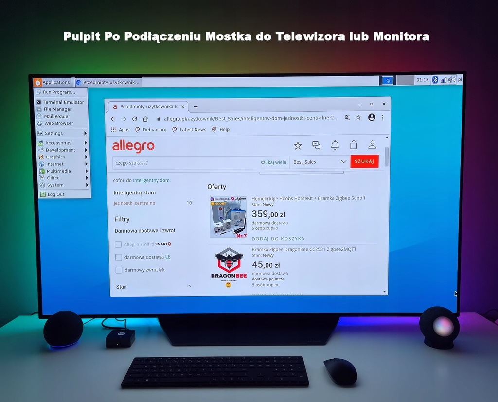 Mostek który oferuje to URZĄDZENIE 2 w 1 - MOSTEK HOMEBRIDGE + MINI KOMPUTER z zainstalowanym pulpitem który wyglądem przypomina Windows. Możesz go podłączyć pod swój telewizor lub monitor i korzystać jak ze zwykłego komputera. Przeglądać strony WWW, dokumenty, odbierać pocztę, drukować a nawet sterować całym systemem Homebridge. Zdjęcie poglądowe dostępne w Galerii.