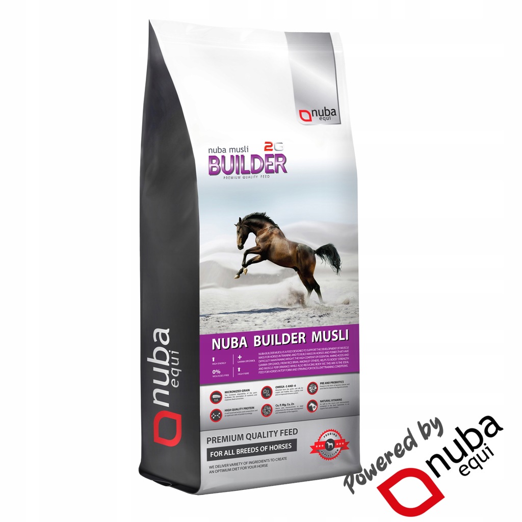Niedobory masy u koni to złożony temat. Podaż energii czy białka to czynniki najczęściej rozpatrywane w przypadku zbyt chudych koni, ale powodów takiego stanu może być wiele. Pasza Builder skomponowana jest tak, by optymalizować metabolizm mięśniowy i jednocześnie zaspakajać potrzeby całego organizmu. Builder Musli zawiera komplet makroelementów, mikroelementów i witamin, których niedobór upośledza tysiące procesów w organizmie, zapobiegając także przyrostowi mięśni czy po prostu „tyciu”. Jest bogata w kwasy tłuszczowe, które są budulcami ścian komórkowych, a bez nich nowe komórki mięśniowe nie mają szans powstać. Białko jest doskonałej jakości, wzbogacone lizyną i metioniną, co ma bezpośredni wpływ na jego przyswajalność. Jest to bardzo istotne, gdyż białko jest najważniejszym budulcem mięśni. Pasza bazuje na otrębach ryżowych znanych ze swoich właściwości wspomagających pracę mięśni. Nuba Builder Musli jest idealną paszą dla koni dążących do doskonałej kondycji wizualnej i treningowej. Pasza stosowana zgodnie z zalecanym dawkowaniem nie wymaga żadnej dodatkowej suplementacji.*