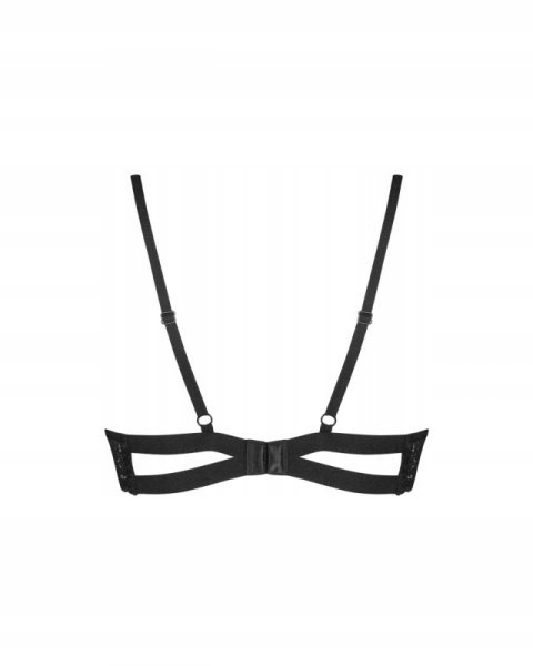 Zmysłowy biustonosz w czarnym kolorze. Elegancki koronkowy materiał z roślinnym wzorem lekko otula biust. O dobre dopasowanie dbają regulowane ramiączka i zapięcie z haftkami na plecach. Biustonosz Nutris zawiera haftki do których można przyczepić pas z kolekcji.