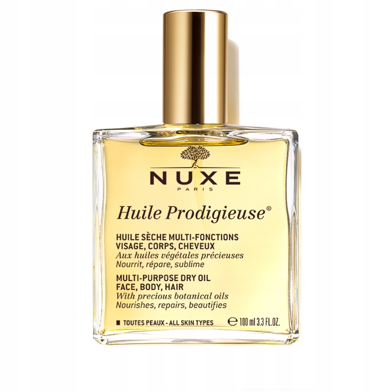 Suchy olejek Huile Prodigieuse® do stosowania przez cały rok, latem i zimą, do pielęgnacji twarzy, ciała i włosów. Główne składniki aktywne pochodzenia naturalnego, w tym 7 szlachetnych olejków roślinnych: