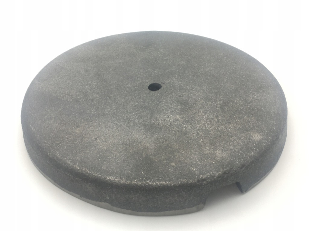 Żeliwny obciążnik do lamp. Obciążnik służy do stabilizacji konstrukcji lamp podłogowych. Obciążnik posiada wgłębienie na przewód oraz otwór montażowy