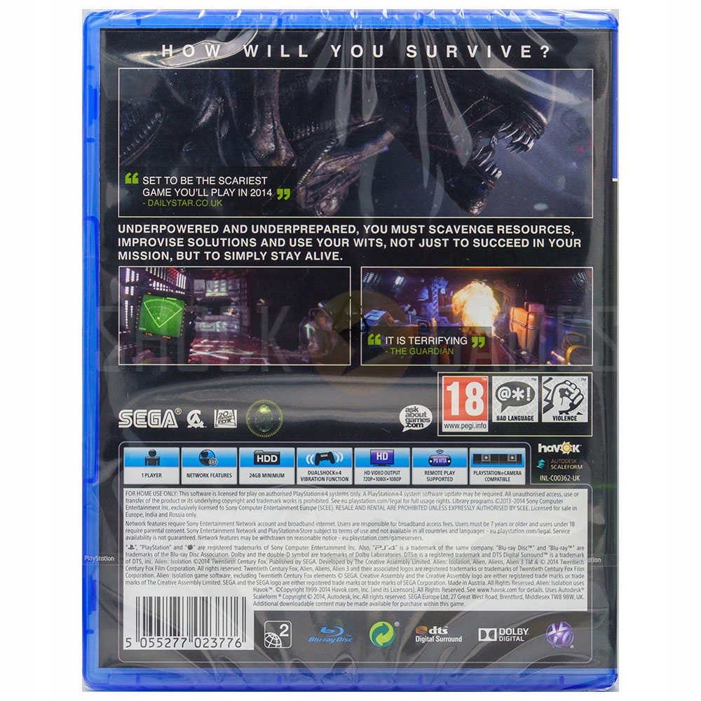Rozgrywka na PlayStation®5: Gra Obcy Izolacja w wersji na konsolę PlayStation®4 na Blu-ray Disc™ musi być włożona do napędu konsoli PlayStation®5, aby można było grać w odpowiadającą jej wersję gry Obcy Izolacja na konsoli PlayStation®5