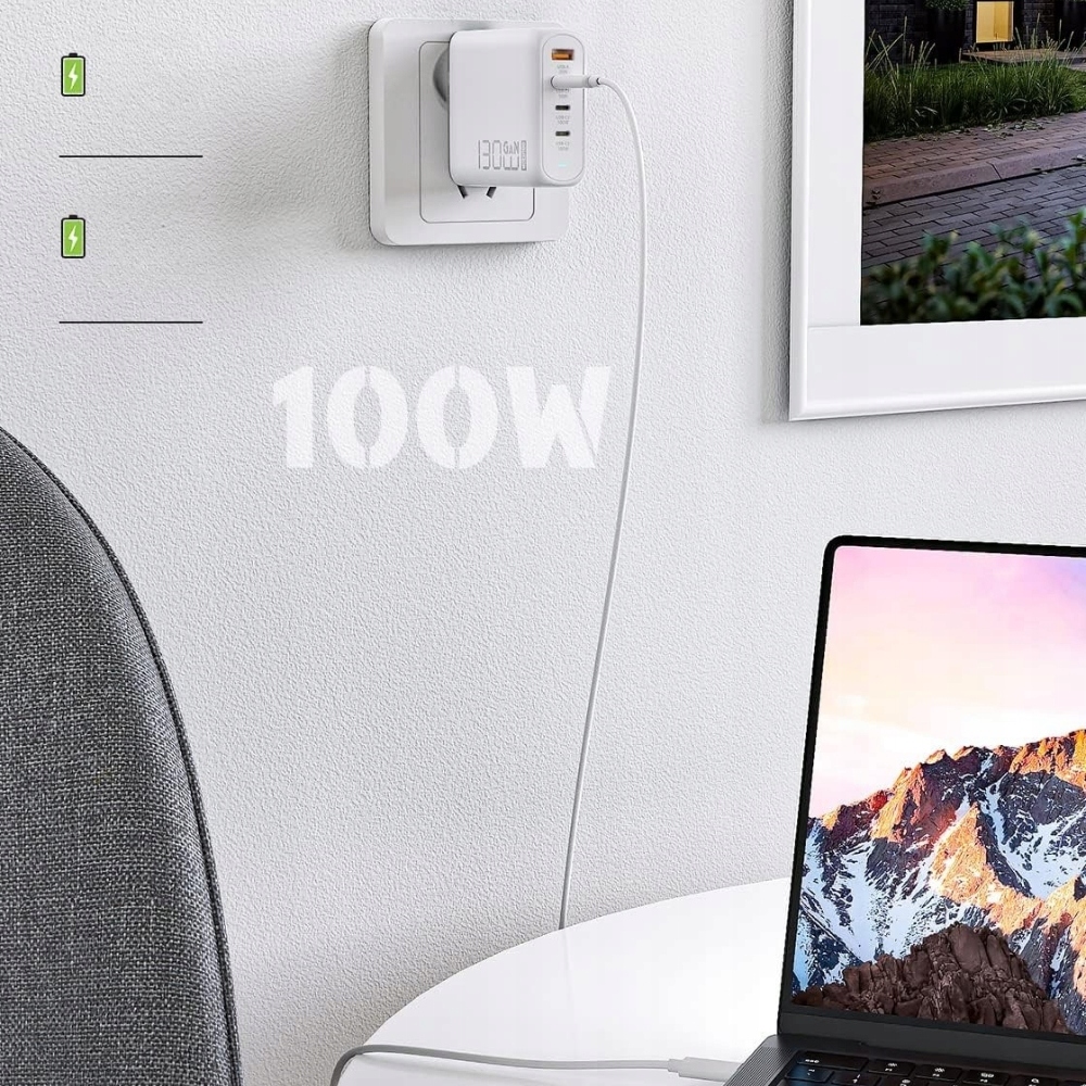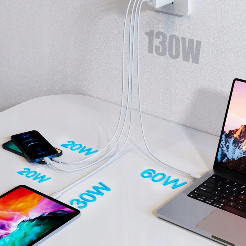 Ta nowoczesna, wieloportowa ładowarka OBLITZON o mocy 130 W to idealne rozwiązanie do szybkiego zasilania wielu urządzeń jednocześnie. Dzięki zaawansowanej technologii GaN, kompaktowej budowie i wsparciu dla najnowszych protokołów szybkiego ładowania, naładujesz swój MacBook Pro, iPhone 14/13, iPada czy dowolne inne urządzenie USB-C i USB-A szybciej i wygodniej niż kiedykolwiek.