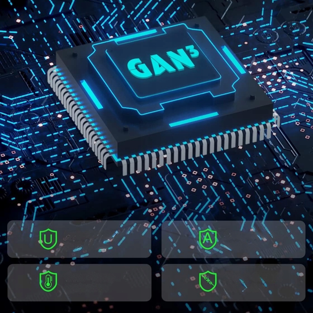 - Technologia: GaN (azotek galu) – mniejsze rozmiary, mniej ciepła, większa efektywność