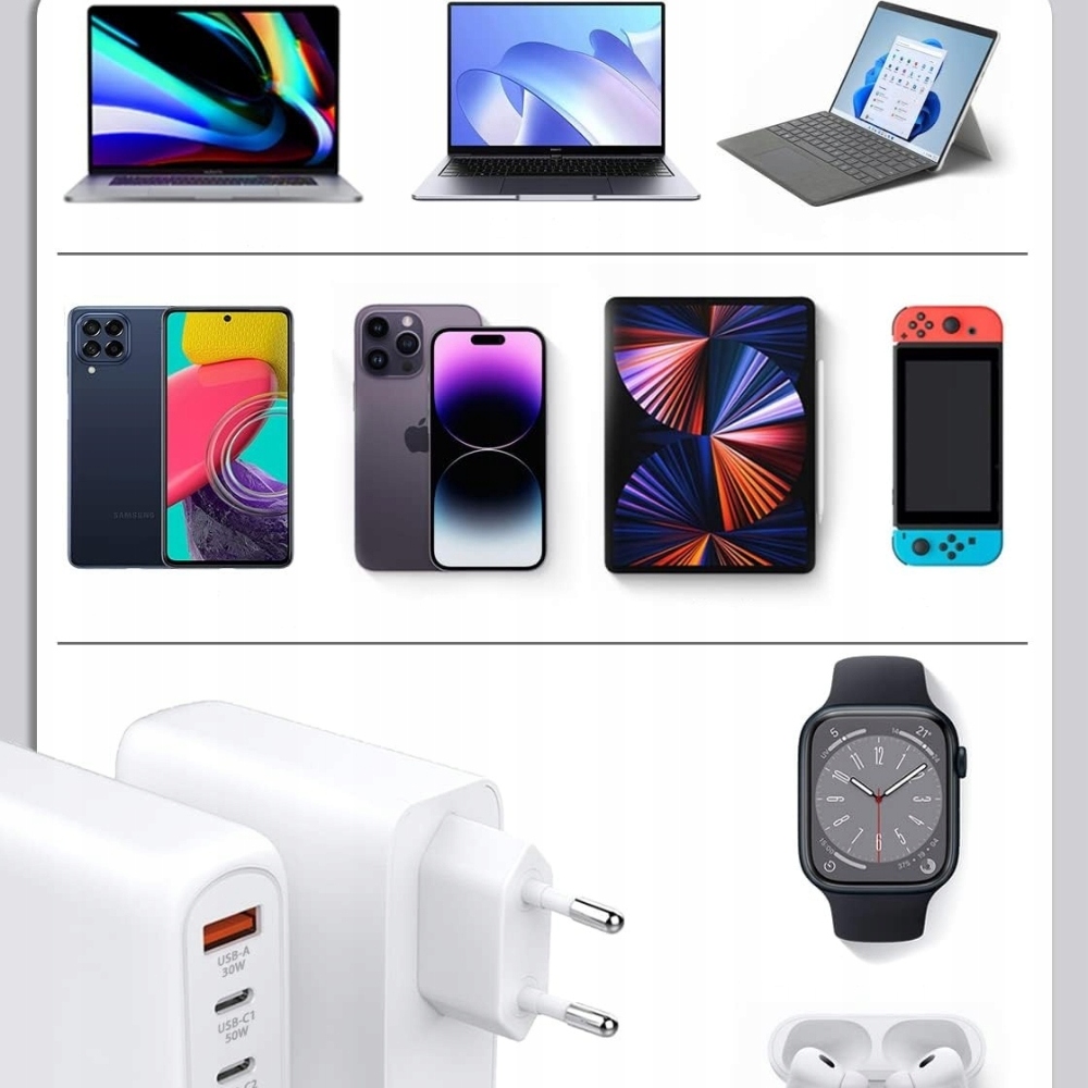 Ładowarka obsługuje niemal wszystkie nowoczesne urządzenia z USB-C i USB-A, także z różnymi protokołami szybkiego ładowania.