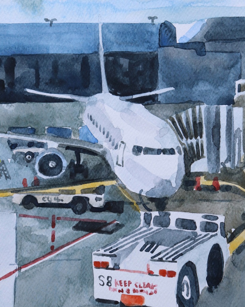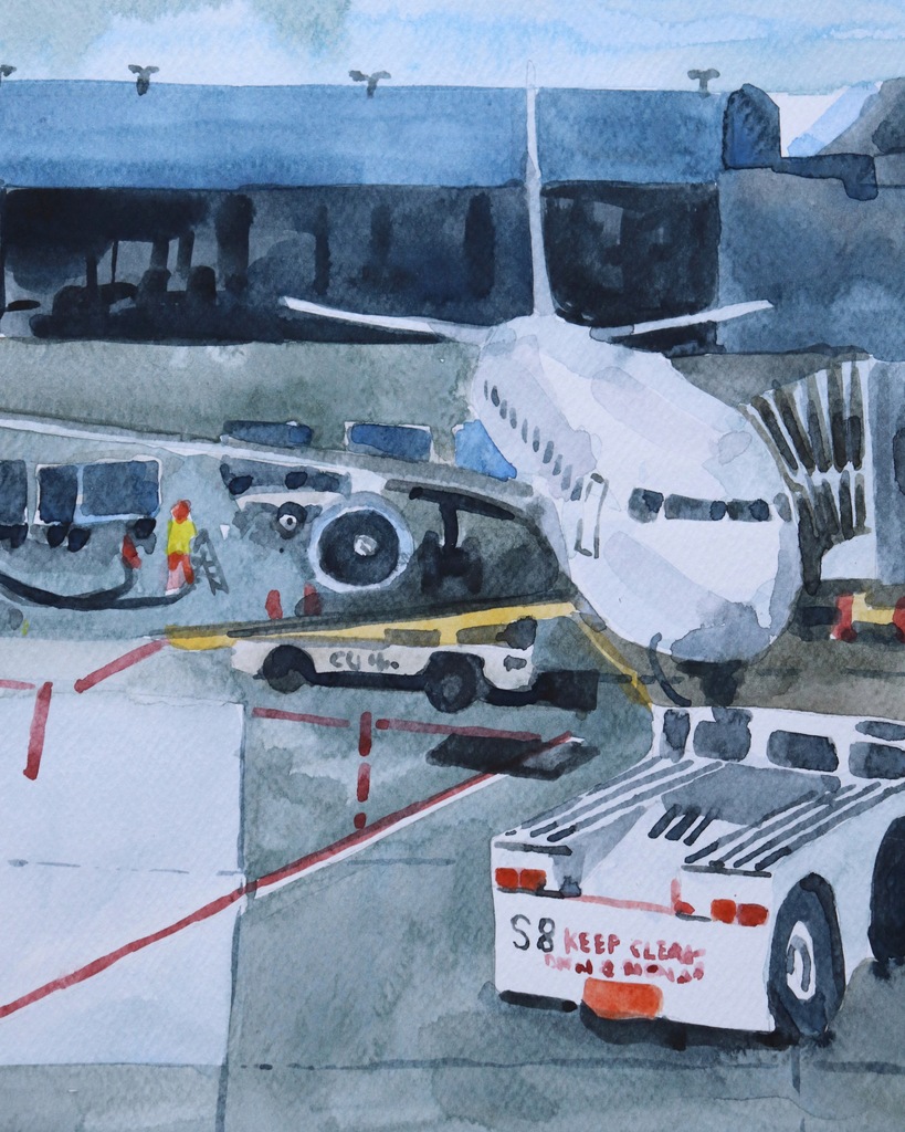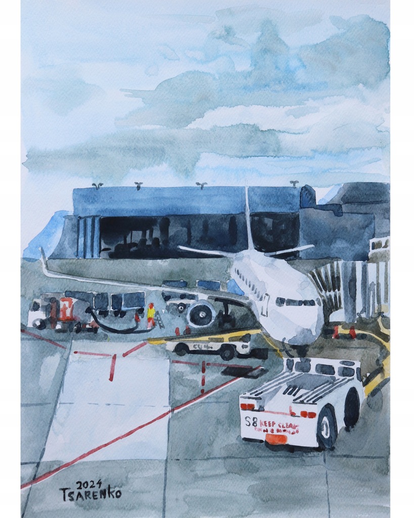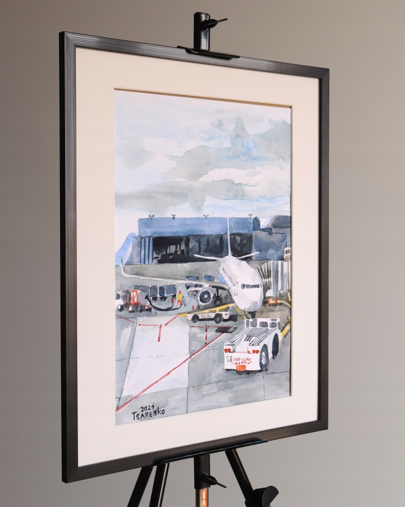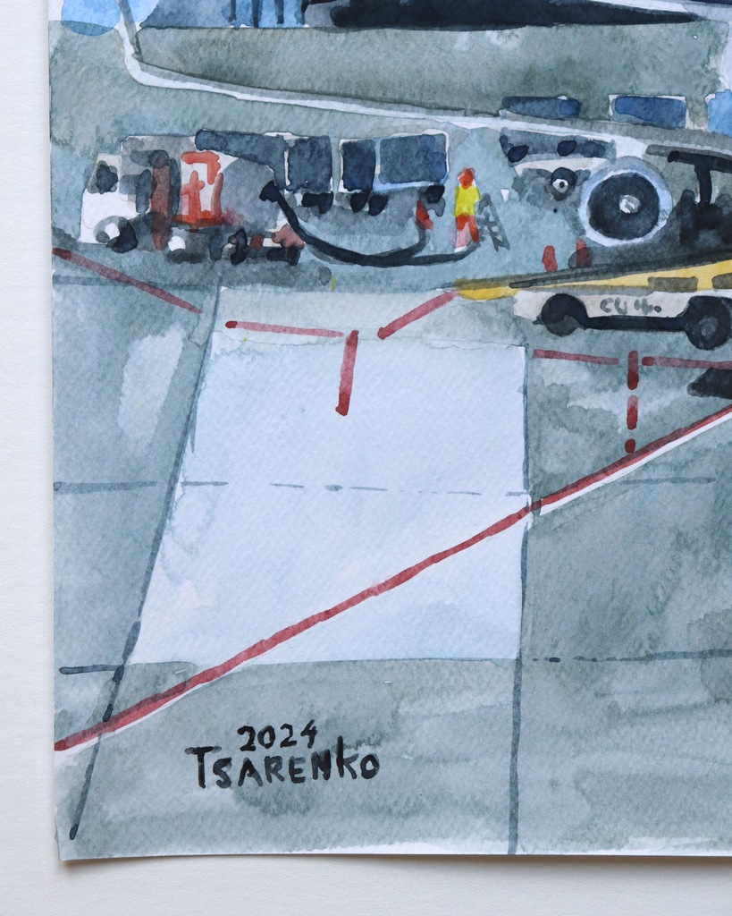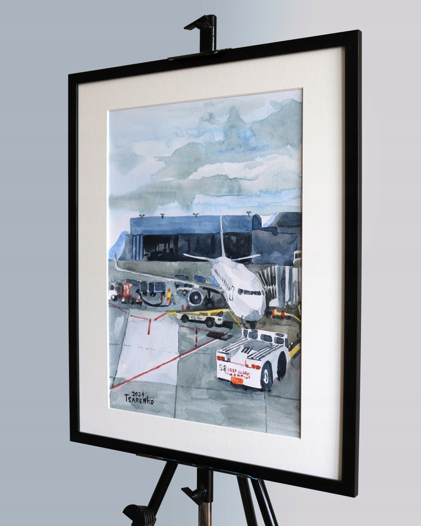 Obraz akwarela "Lotnisko" 420×297 мм. (A3) Malowany na papierze 300g./m2, 30% cotton. Różnorodność barw nadaje pomieszczeniu charakter.