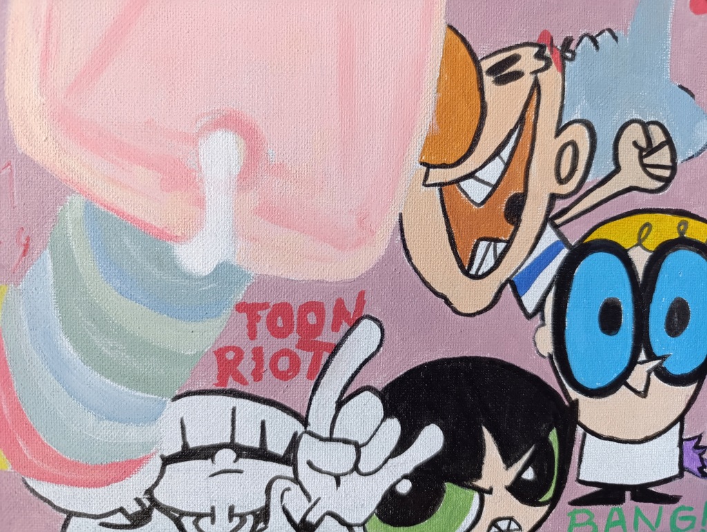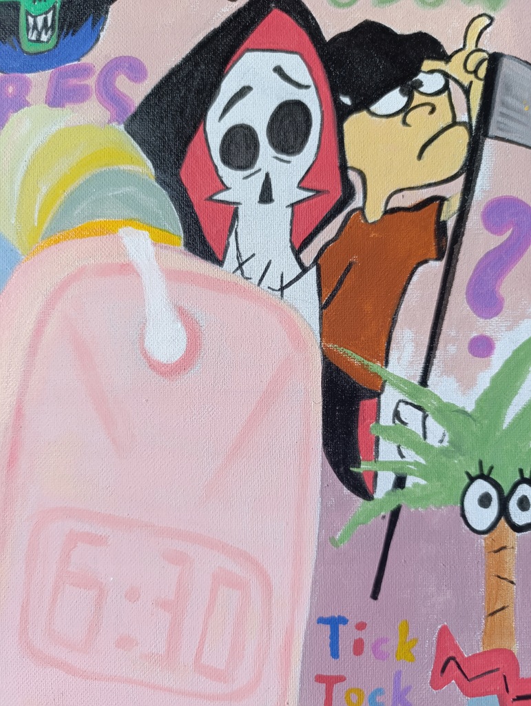 Obraz wykonany farbami akrylowymi na płótnie malarskim naciągniętym na drewnianą ramę. Namalowany przy użyciu pędzli.