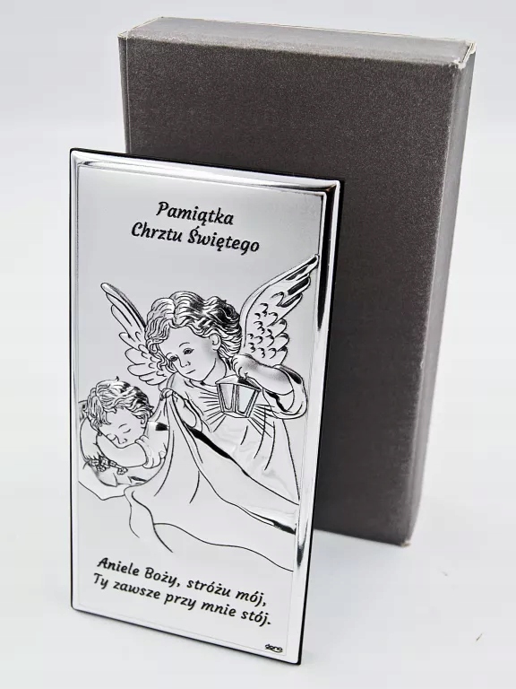 OBRAZ SREBRNY ANIOŁ STRÓŻ PAMIĄTKA CHRZTU OBRAZEK