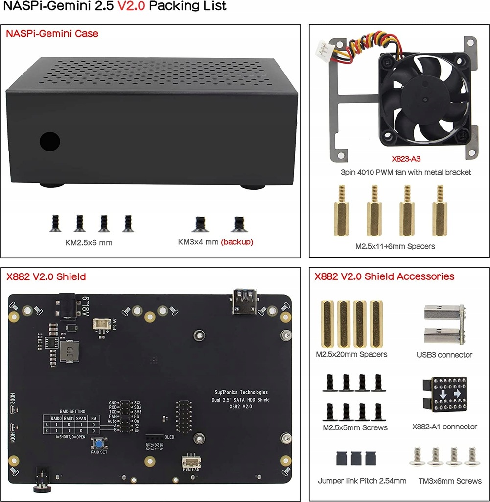【Nowa obudowa NASPi-Gemini 2.5 V2.0 Dual 2,5" SATA】 NASPi Gemini oferuje łatwy i szybki sposób na stworzenie domowego centrum multimedialnego i zbudowanie serwera NAS lub serwera internetowego dla Raspberry Pi 4 z dwoma 2,5-calowymi dyskami twardymi/SSD SATA