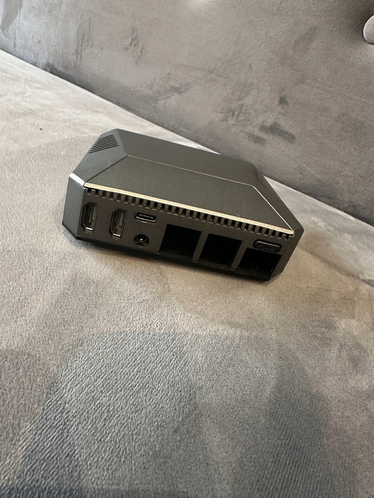 Aluminiowa obudowa w kolorze szarym dla minikomputera Raspberry Pi 4B. Obudowa została wyposażona w dodatkowy adapter wyprowadzający wszystkie złącza na przednią część. Dodatkowo posiada zamontowany wentylator, elementy stykające się z IHSem (Integrated Heat Spreader) procesora oraz pamięcią i odpowiednie otwory wentylacyjne, zapewniające wydajne chłodzenie Raspberry Pi.