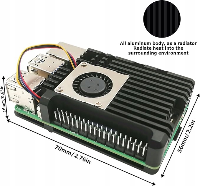 Obudowa radiatora do Raspberry Pi 5 z wydajnym, a mimo to cichym dużym wentylatorem, ta obudowa zapewnia wydajne odprowadzanie ciepła, aby wydłużyć żywotność Raspberry Pi 5.
