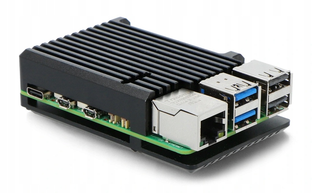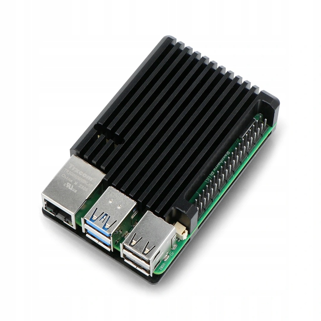 Czarna aluminiowa obudowa do Raspberry Pi 5 zaprojektowana jako solidny radiator , która umożliwia efektywne chłodzenie urządzenia oraz zapewnia ochronę przed uszkodzeniami mechanicznymi. W zestawie z niezbędnymi elementami montażowymi.