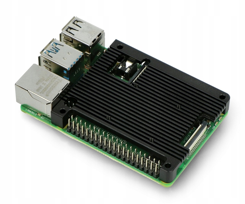 Aluminiowa obudowa do Raspberry Pi 4B pełniąca funkcję radiatora. Obudowa w kolorze czarnym o wymiarach 66 x 56 x 9 mm pozwala na efektywne ochładzanie minikomputera w trakcie pracy. Zestaw zawiera również tuleje dystansowe różnej wielkości, ułatwiające montaż na Raspberry Pi 4B z nakładkami rozszerzającymi.