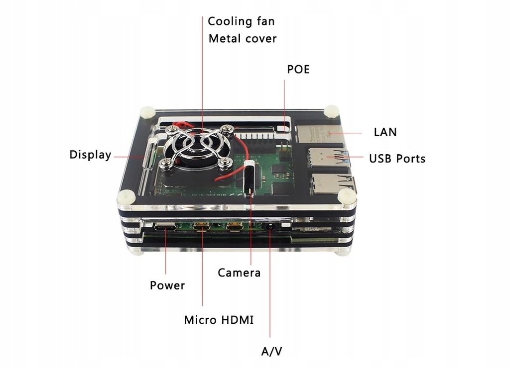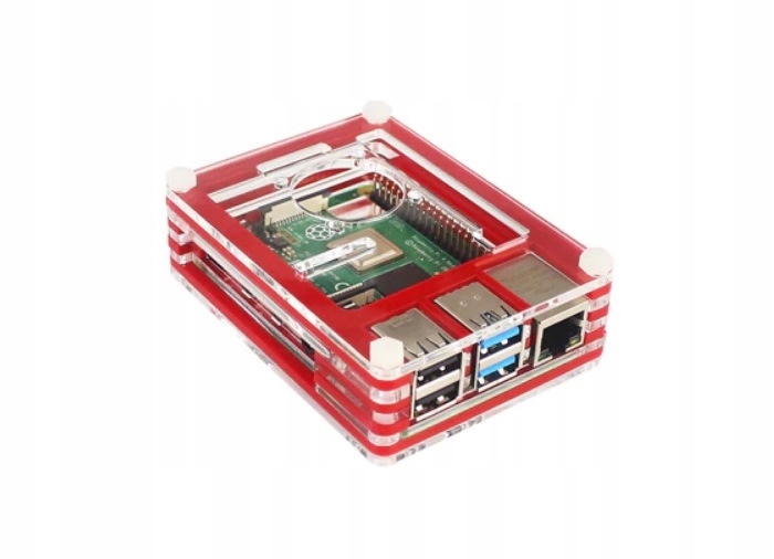 Przedmiotem sprzedaży jest obudowa czerwono-przezroczysta do minikomputera Raspberry Pi w wersji 3B, 2B i 1B+ o wymiarach zewnętrznych 94x70x25 mm. Obudowa składa sie z 9-ciu warstw czerwono-przezroczystych, naprzemiennie ze sobą ułożonych, tworząc efektowną kompozycję. Obudowa posiada otwór na wentylator o wymiarach 28x28x9 mm oraz otwory na wyprowadzenia GoldPin GPIO 40 wraz z otworami dla kamery i wyświetlacza.