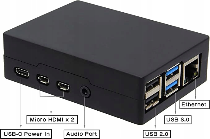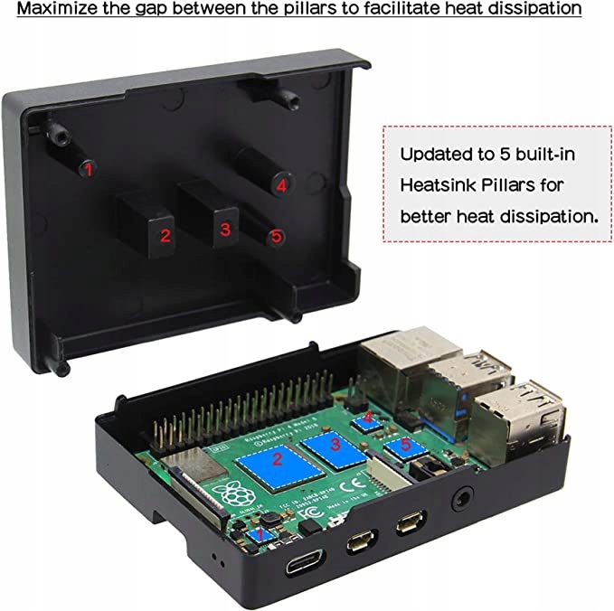 Geekworm Raspberry Pi 4 aluminiowa obudowa z pasywnym chłodzeniem dla Raspberry Pi 4B (2 GB/4 GB/8 GB); Dobre odprowadzanie ciepła - pasywna konstrukcja chłodzenia, nie wymaga instalowania wentylatora ani radiatora, zawiera 5 taśm termicznych do podłączenia do procesora, pamięci RAM i układu USB Raspberry Pi 4 dla lepszej przewodności cieplnej, z 4 gumowymi podkładkami na nóżki przymocuj do spodu obudowy Wykonany z wysokiej jakości materiału aluminiowego, z nadbudową kolumnową konstrukcją górnej pokrywy, 5 kolumn kontaktowych z Raspberry Pi 4 (CUP, RAM i układ USB) poprzez przekładki termiczne do przenoszenia ciepła na aluminiową obudowę i ochrony Raspberry Pi 4 przed problemem przegrzania. Dostęp do wszystkich portów Raspberry Pi 4 Model B, interfejs kabla GPIO jest zarezerwowany, obsługa instalacji kabla GPIO. Raspberry Pi 4 Model B nie znajduje się na liście pakowania.