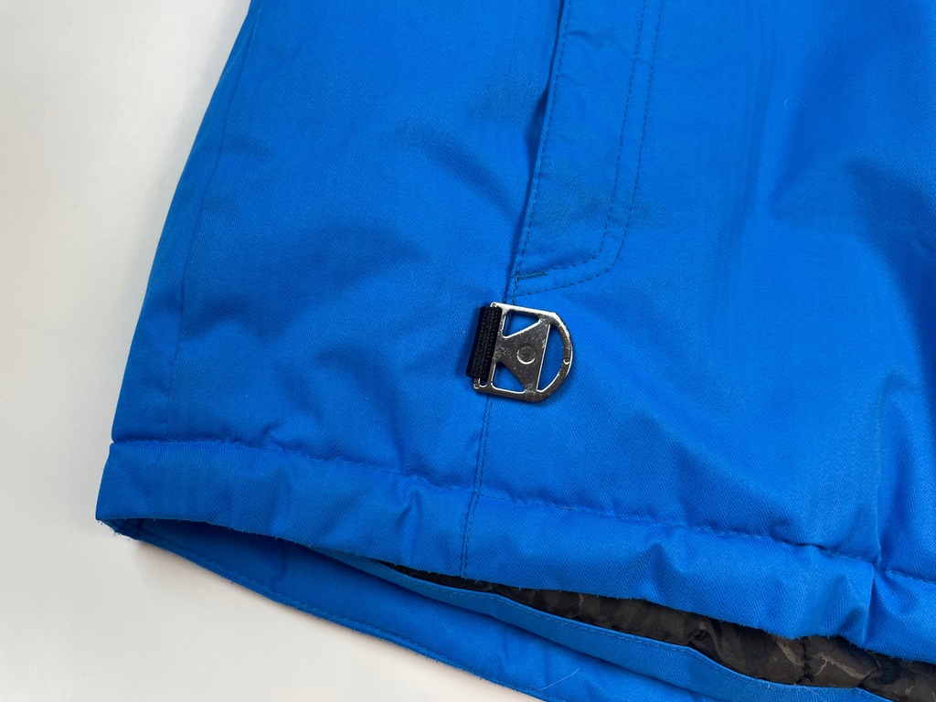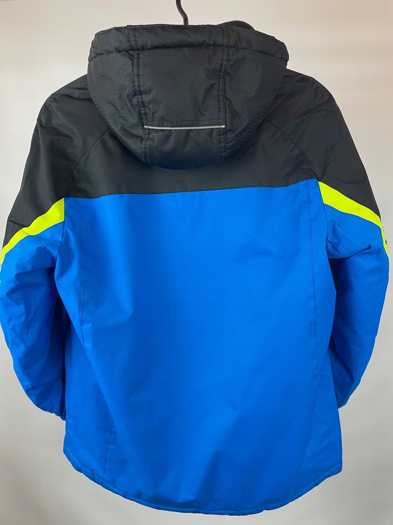 Chłopięca kurtka zimowa w kolorze niebieskim, czarnym z limonkowymi elementami. Ma ocieplany polarkiem kaptur, który można odpiąć. Jest zapinana na zamek typu YKK, rzepy oraz dodatkowe napy. Rękawy można regulować w nadgarstkach za pomocą rzepów, tak aby lepiej dopasować szerokość.