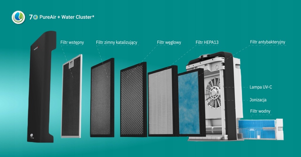 - Filtr HEPA13 wraz z katalizującym i antybakteryjnym usuwa niewielkie cząstki o wielkości zaledwie 0,3 mikrona, takich jak: smog, wirusy, alergeny, bakterie i nieprzyjemne zapachy.