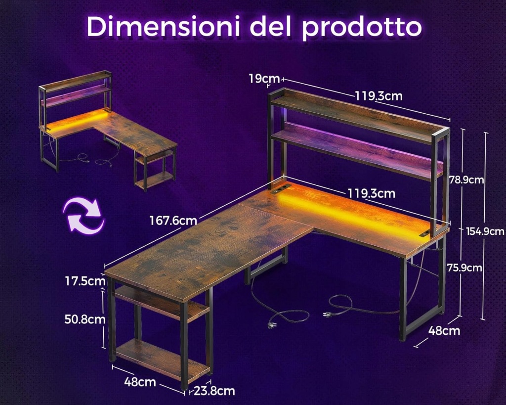 To biurko w kształcie litery L wyposażone jest w 1 podstawkę na komputer, 2 schowki, 2 metalowe haczyki, 2 gniazdka elektryczne oraz 2 rodzaje pasków świetlnych. Idealne rozwiązanie do małych przestrzeni – zapewnia dużo miejsca do pracy zdalnej lub grania.