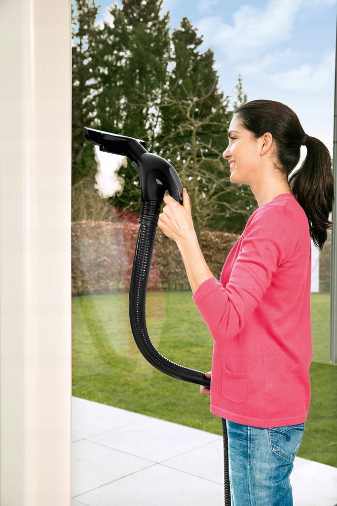 Czyszczenie parą i odsysanie jej w jednym przejściu roboczym umożliwia skuteczne czyszczenie okien, luster, podłóg drewnianych i odświeżanie tapicerki.