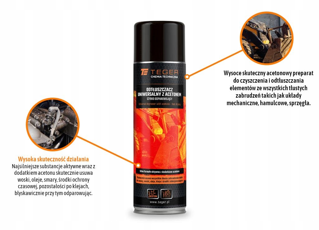 Odtłuszczacz uniwersalny z acetonem - szybko odparowujący 500 ml / TEGER Wysoce skuteczny acetonowy preparat do czyszczenia i odtłuszczania elementów ze wszystkich tłustych zabrudzeń takich jak układy mechaniczne, hamulcowe, sprzęgła. Najsilniejsze substancje aktywne wraz z dodatkiem acetonu skutecznie usuwa woski, oleje, smary, środki ochrony czasowej, pozostałości po klejach, błyskawicznie przy tym odparowując. Preparat świetnie nadaje się do przygotowania powierzchni przed klejeniem i malowaniem. SPOSÓB UŻYCIA: Przed użyciem pojemnik silnie wstrząsnąć. Zanieczyszczoną powierzchnię spryskać z odległości ok. 20 cm i odczekać, aż środek rozpłynie się. Czyszczone części pozostawić do wyschnięcia lub wytrzeć suchą ściereczką. W razie potrzeby czynność powtórzyć. MAGAZYNOWANIE: Pojemnik pod ciśnieniem, chronić przed promieniami słonecznymi i temperaturą powyżej 50 °C.