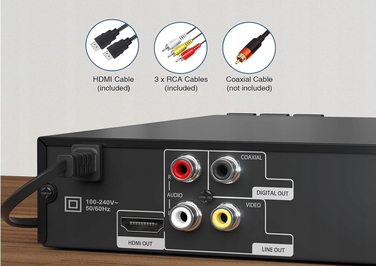 Wyjście HDMI (do telewizora/projektora), 3 x wyjścia RCA AV (do telewizora/projektora), koncentryczne cyfrowe wyjście audio (do amplitunera)