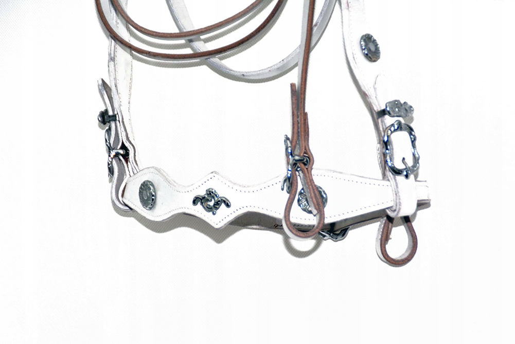 Ogłowie Hiszpańskie+ wodze anatomicznie profilowane roz. Full .Ogłowie wyprodukowane w zakładzie Rymarskim w Franci .Wykonane z najwyższej jakości skóry bydlęcej bardzo miękkiej i miłej w dotyku .Ogłowie zapinane i regulowane jest na stabilne sprzączki , wykonane z bardzo dobrej nierdzewnej stali szlachetnej. Zestaw sprzedawany widoczny na zdjęciach ,bez napierśnika Zapraszam do zakupu. Jedyny taki model w Polsce