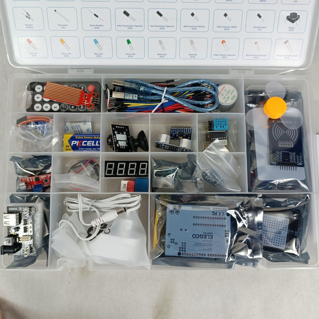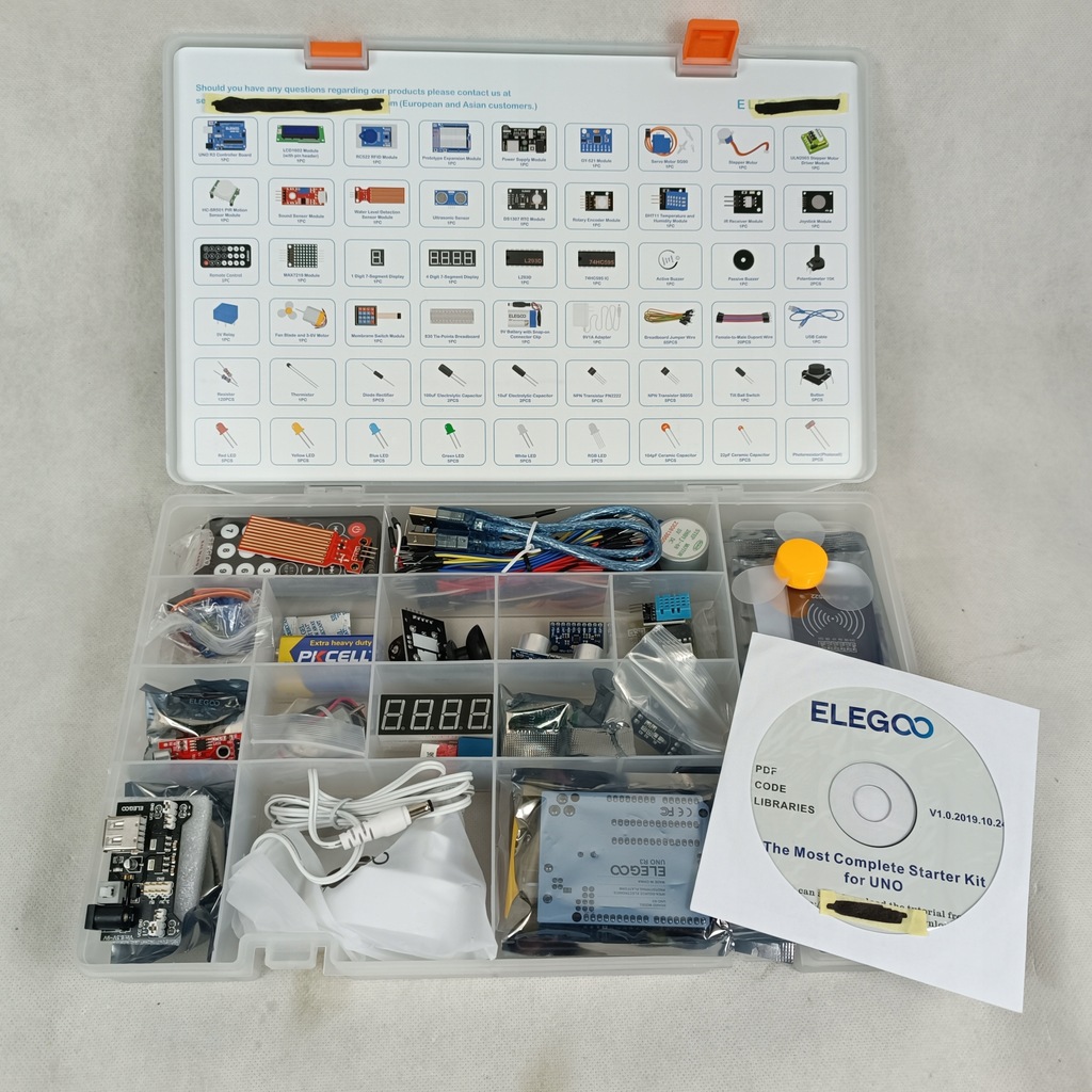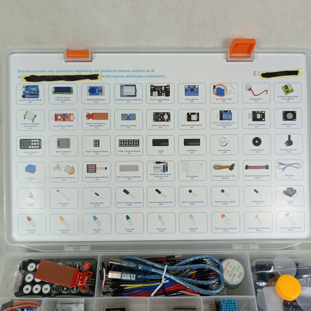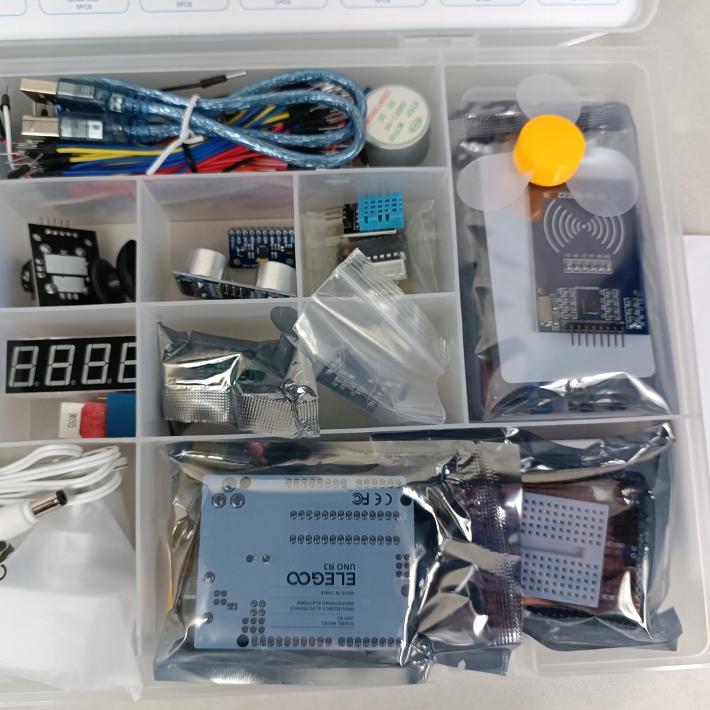 Zestaw zawiera wyświetlacze, silniczki, sensory ruchu, odległości, wilgotności, temperatury, RFID, IR, i wiele innych!
