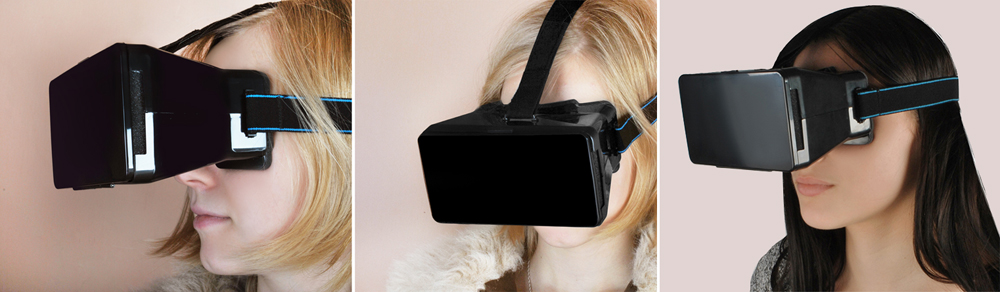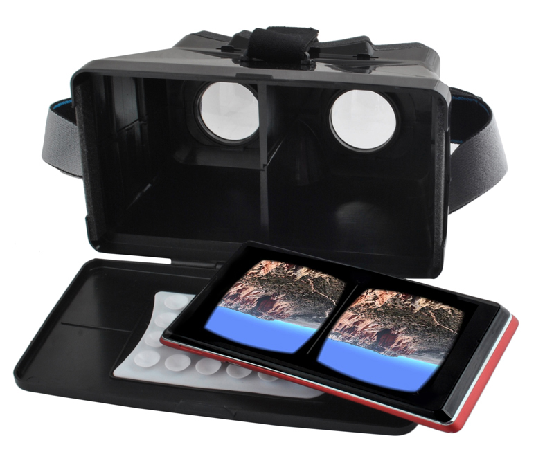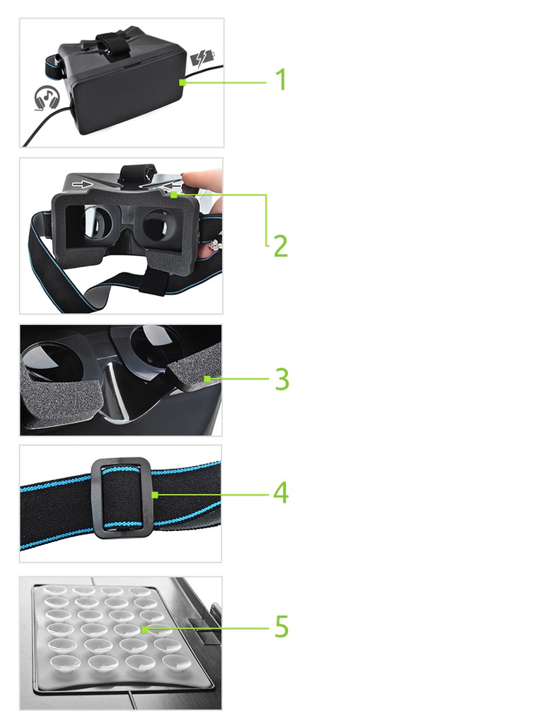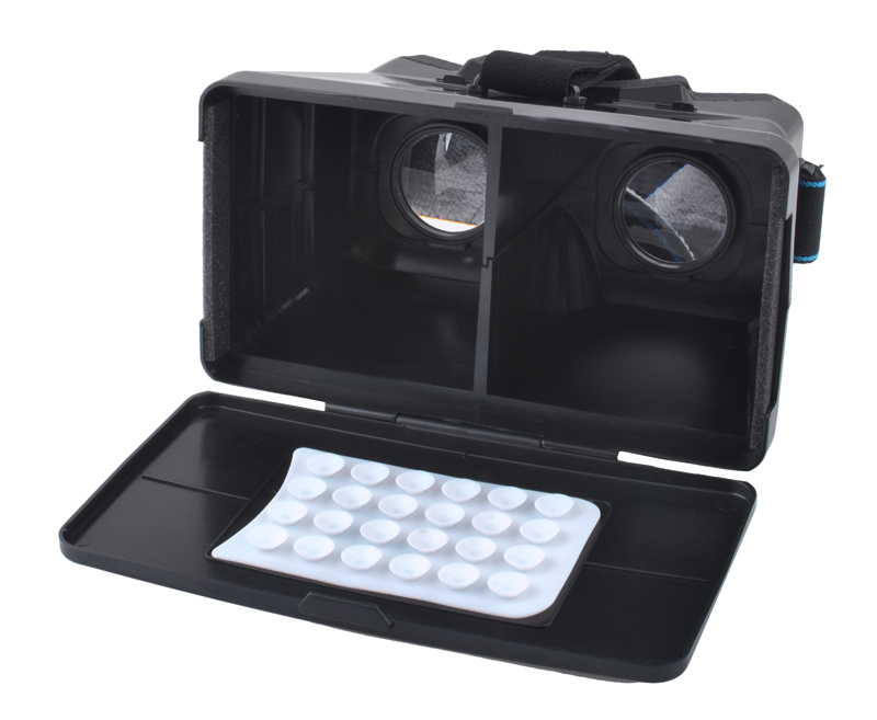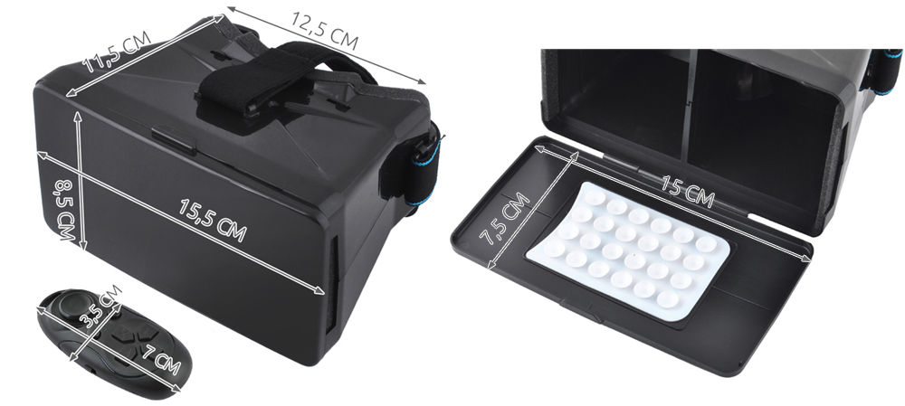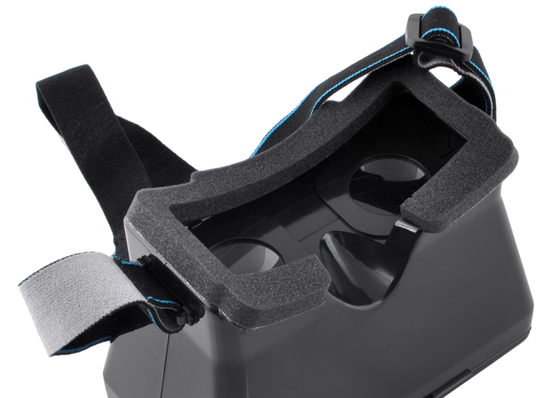 Miękka gąbka przy okularach zapewnia komfort użytkowania. Wewnętrzna komora na telefon wyposażona została w specjalne przyssawki, które utrzymują urządzenie w miejscu. Rozstaw soczewek jest regulowany.