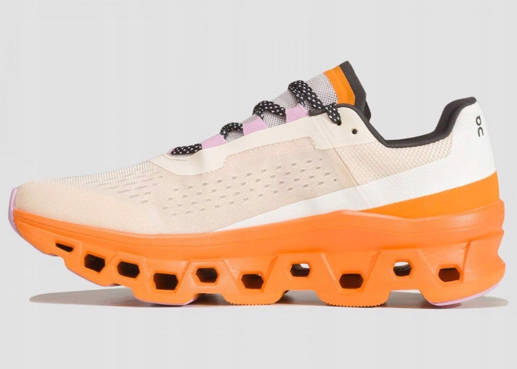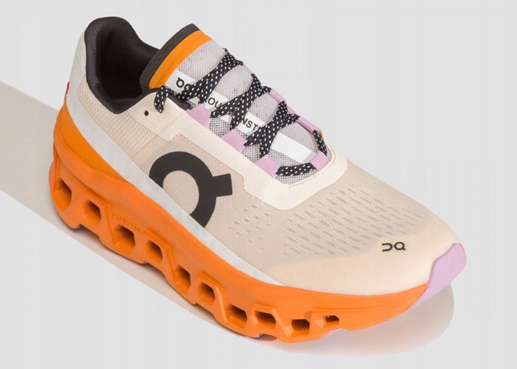 Półbuty damskie marki On Running model Cloudmonster 6198652 w kolorze beżowo-pomarańczowym. On Running Cloudmonster to zupełnie nowa propozycja od szwajcarskiej marki On Running. Skierowana jest do biegaczy poszukujących wygodnych, miękkich i dynamicznych butów. Ich konstrukcja składa się z największych jak dotąd chmur opartych o superpiankę Helion. Miękka wkładka wraz z cholewką zapewniają komfort na najwyższym poziomie. Dodatkowo, zostały wykonane częściowo z materiałów z recyklingu. W ciepłe dni możemy liczyć na dobrą wentylację i doskonałe dopasowanie otulające stopę, bez ryzyka podrażnień. Cienki język poprawia ten efekt dopasowując się wygodnie do podbicia. W miejscach narażonych na najszybsze zużycie zastosowano wytrzymała gumę. Sprawdzi się doskonale na twardych nawierzchniach oferując dobrą przyczepność. Ponad 80% zastosowanego poliestru i ponad 30% całego buta wykonano z materiałów pochodzących z recyklingu. Poczuj nowy wymiar amortyzacji z butami biegowymi On Running Cloudmonster. Przeznaczone do treningu na twardych nawierzchniach, gdzie odkryjesz kolejny poziom biegania po chmurach, tym razem w wersji MONSTER.