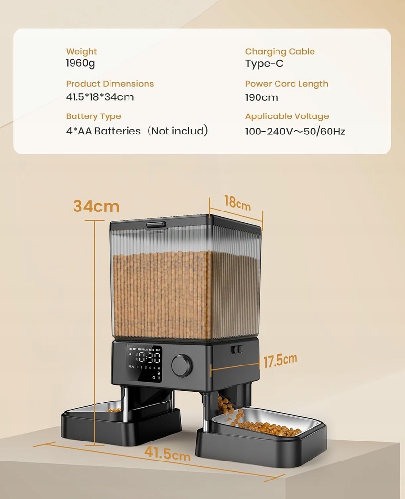 ✅ Duża pojemność – zbiornik na 20 kubków karmy (ok. 5L)