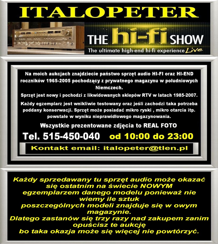 Sprzęt może posiadać mikro ryski , mikro otarcia itp. powstałe na wskutek nienależytego przechowywania sprzętu przez wiele lat w magazynie.Sprzęt pochodzi z likwidacji sklepów RTV małych Europejskich miasteczek w latach 1985-2007.