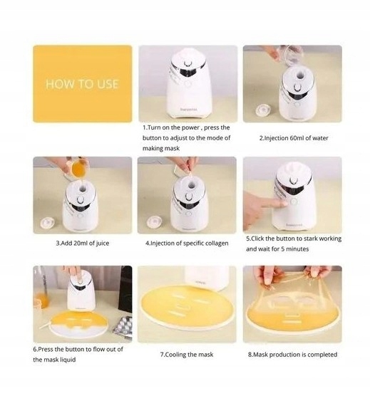 - Maszyna do wykonywania naturalnych maseczek do twarzy z owoców i warzyw, bez konserwantów, bez ołowiu, nie zawiera rtęci ani innych substancji drażniących.