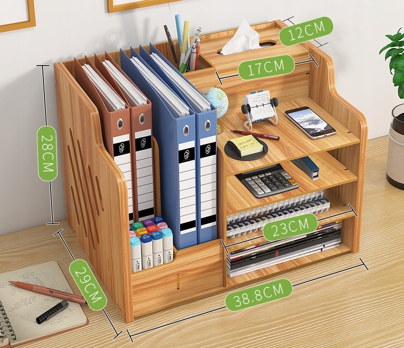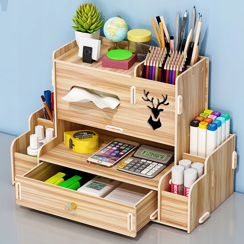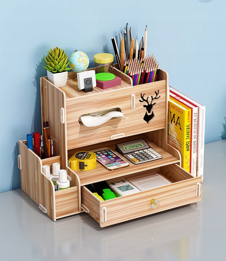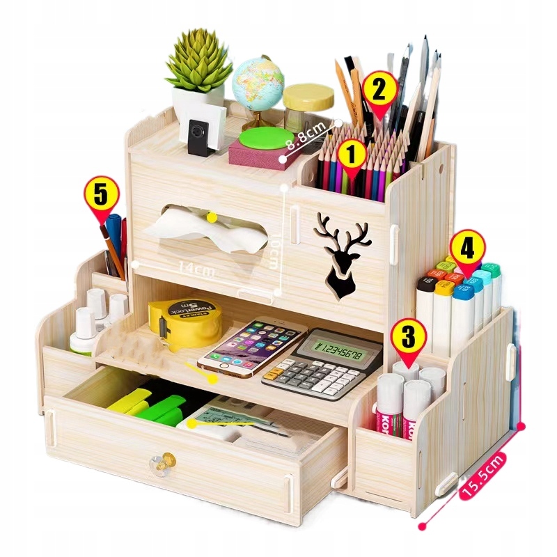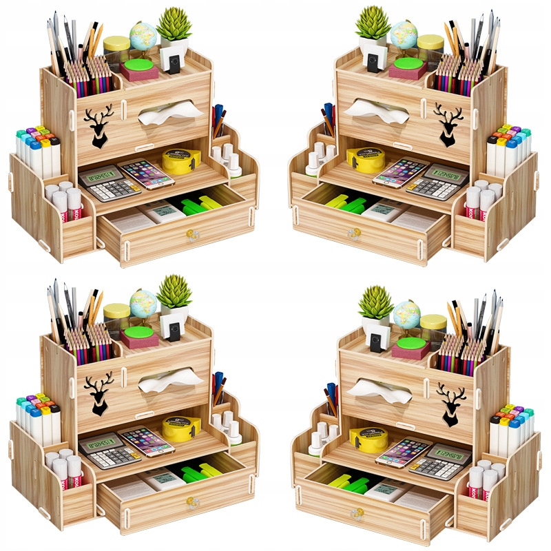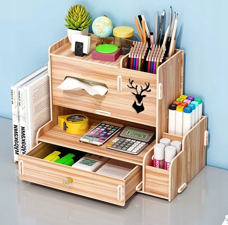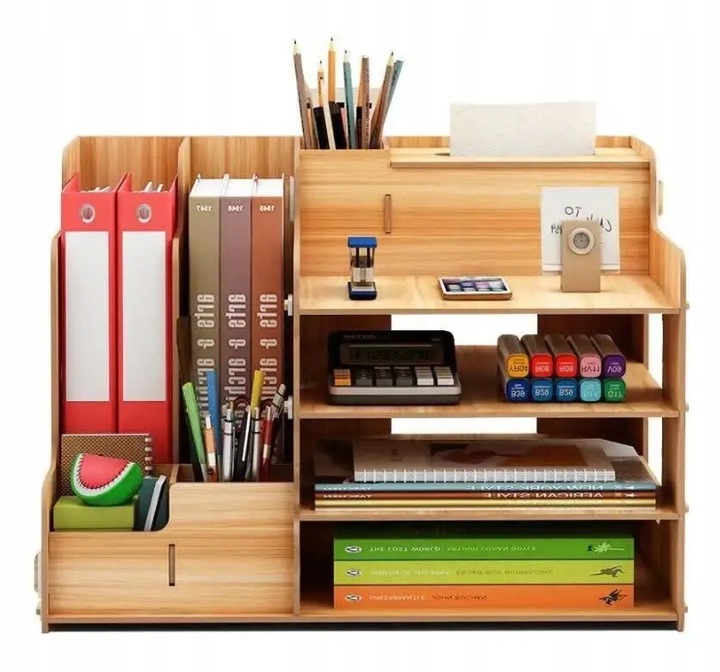 Drewniany organizer na biurko to praktyczny i elegancki sposób na utrzymanie porządku na biurku. Składa się z kilku półek, szuflady i innych przegródek, które umożliwiają przechowywanie różnych przedmiotów, takich jak długopisy, ołówki, nożyczki czy klucze.