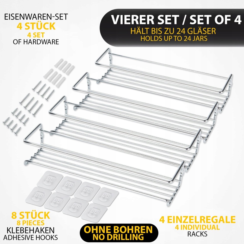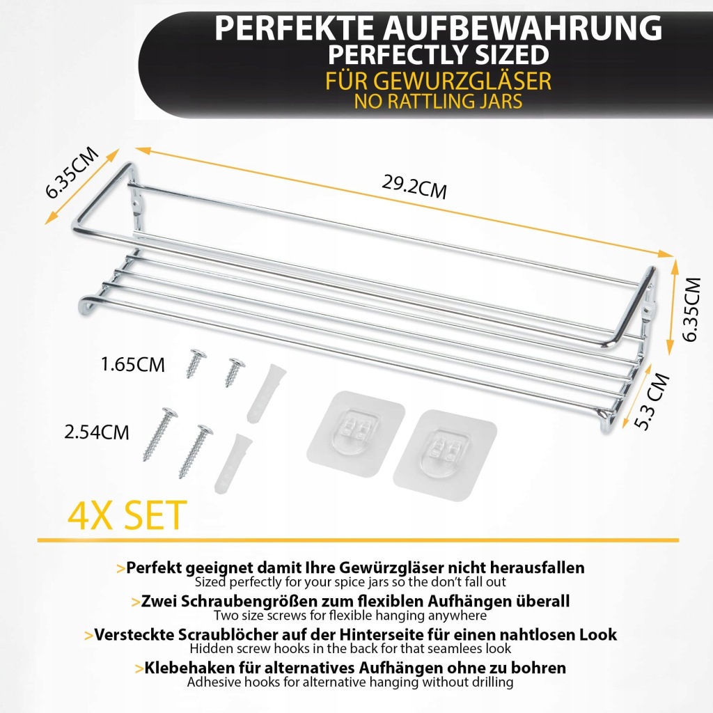 Dwa sposoby montażu: Stojaki na przyprawy GEEDIAR mają dwa sposoby montażu.Możesz powiesić stojaki na przyprawy na ścianie bez wiercenia lub powiesić za pomocą śrub.8 naklejek samoprzylepnych, 8 śrub i kołków w zestawie.