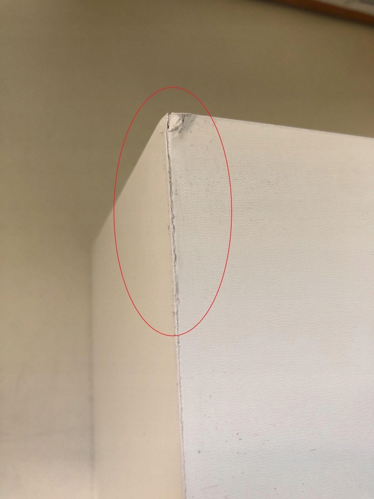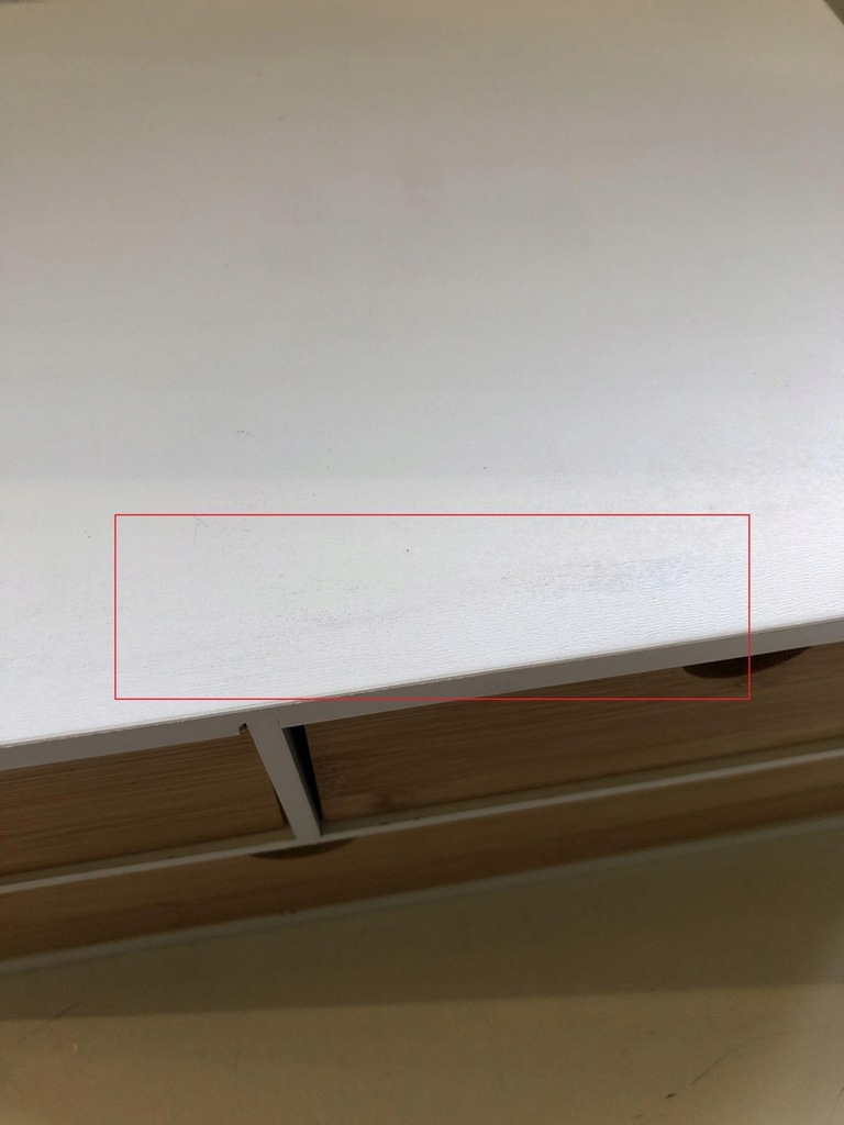 Wada fabryczna zaznaczona kolorem niebieskim - krzywa ścianka dzieląca szuflady, przez co jedna z szuflad trudniej się wysuwa. Ubicie oraz odpryski farby zaznczone koloem czerwonym.