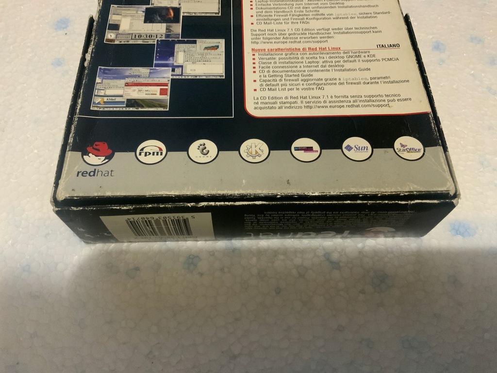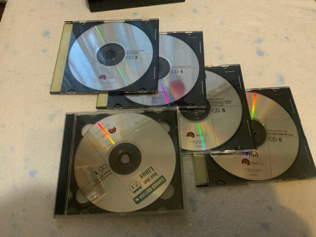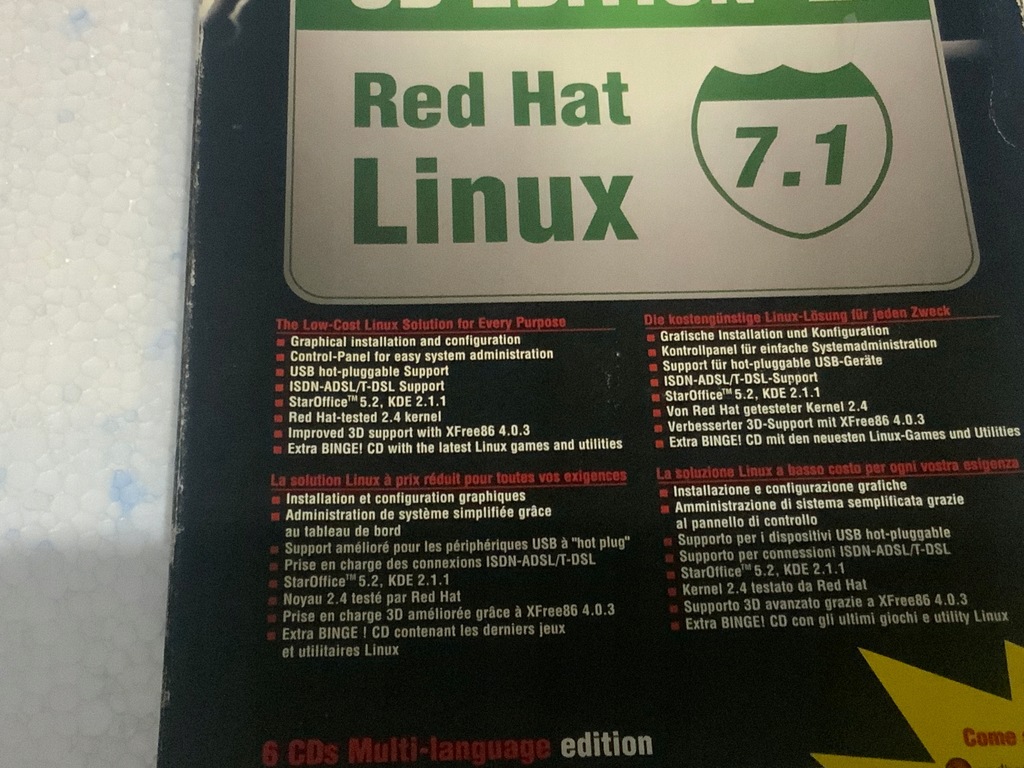 Oryginalna pudełkowa wersja Linuxa Red HAT 7.1 na czterech płytach plus dodatki StarOffice 5.2 oraz CD GAMEs na dwóch płytach.
