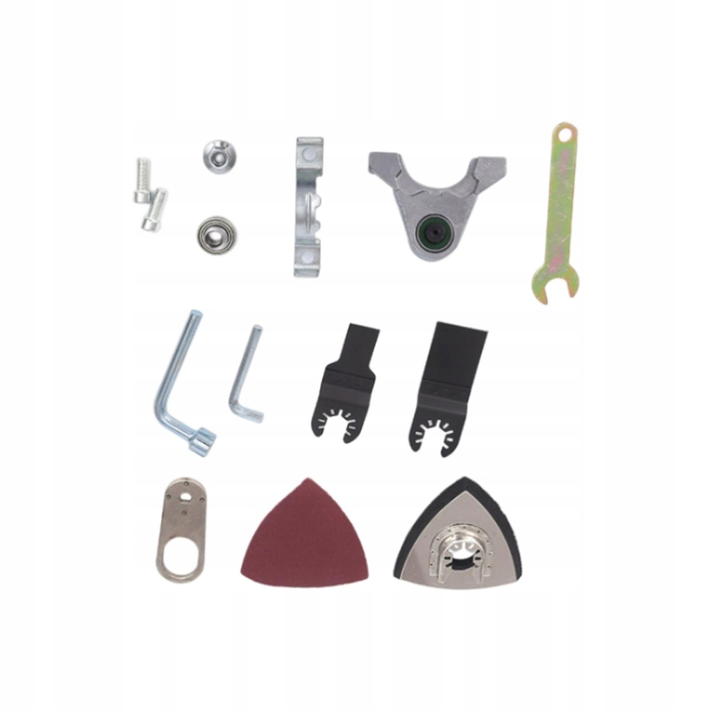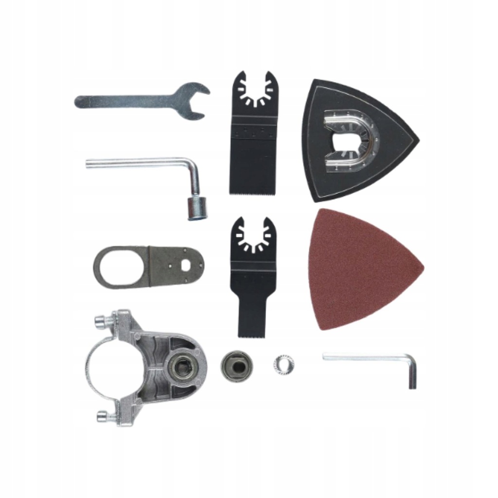 [Package Contains]: 1x adapter head, 2x saw blade, 1x sanding disc, 2x sand papers, 1 set of installation wrench.