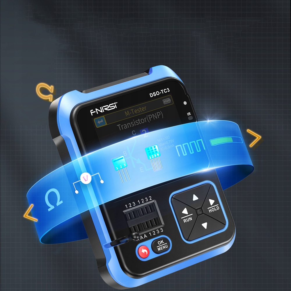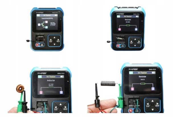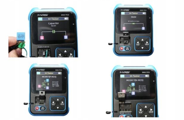 Funkcja testera tranzystorów: automatycznie identyfikuje i mierzy różne tranzystory, w tym triodę NPN i PNP, N-kanałowy i P-kanałowy tranzystor polowy z tlenkiem metalu i półprzewodnikiem, JFET, diody, podwójną diody, tyrystory, a także tranzystory, cewki indukcyjne, kondensatory ,tranzystor polowy itp. element bierny. Automatyczne ustalenie równorzędnych pinów.