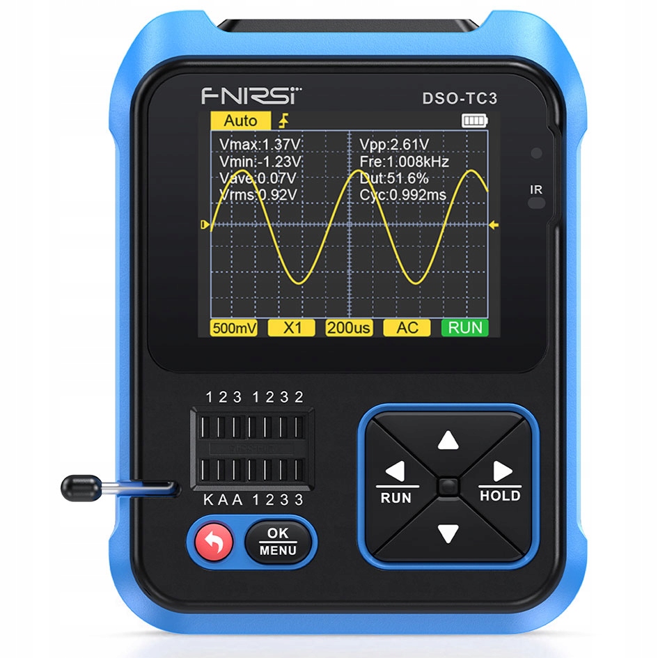 Ten produkt genialnie integruje funkcje oscyloskopu technicznego, testera tranzystorów i generatora postrzegania w jednym urządzeniu. Z częstotliwością próbkowania w rzeczywistości 10 MS/si przepustowością 500 Khz. Obsługuje maksymalny pomiar pomiaru napięciowego 400 V. Z pełną funkcją spustu (automatyczny, zewnętrzny, regularny). Uruchomienie w przycisk AUTO, zmierzony przebieg można wykorzystać bez uciążliwych funkcji. Automatycznie identyfikuj i mierz różne tranzystory. Automatyczne ustalenie równorzędnych pinów. 6 rodzajów generowania przebiegów. I z grupy testu ciągłości.